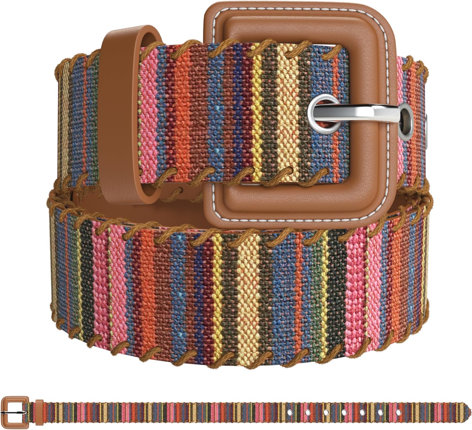 - Casual and Classy Belt for Women, a boho belt that blends uniqueness and charm. This woven fabric womens belt boasts vibrant colors for an authentic boho style. Stand out with its exceptional design, featuring a leather enclosed square buckle belt that adds a touch of elegance and individuality to your look.
